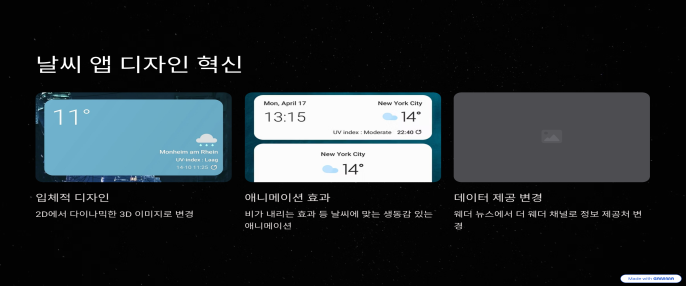 기존 2D에서 입체적인 디자인으로 바뀌었고, 소낙비, 흐림 등 날씨 효과가 애니메이션으로 표현됩니다.
